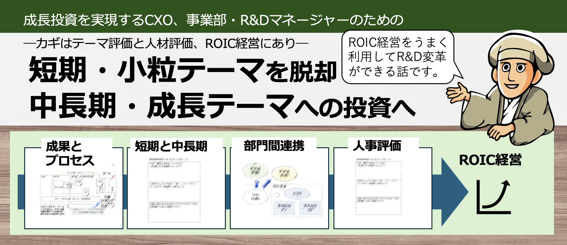 あなたは、このような課題を抱えていませんか? ✅ 「自社は小粒テーマばかりで短期志向。組織構造的に中長期に投資ができないが大丈夫か?」 ✅ 「テーマ評価をしてみると小粒なのに驚いたが、テーマを推進している技術者は問題を感じていないこ……