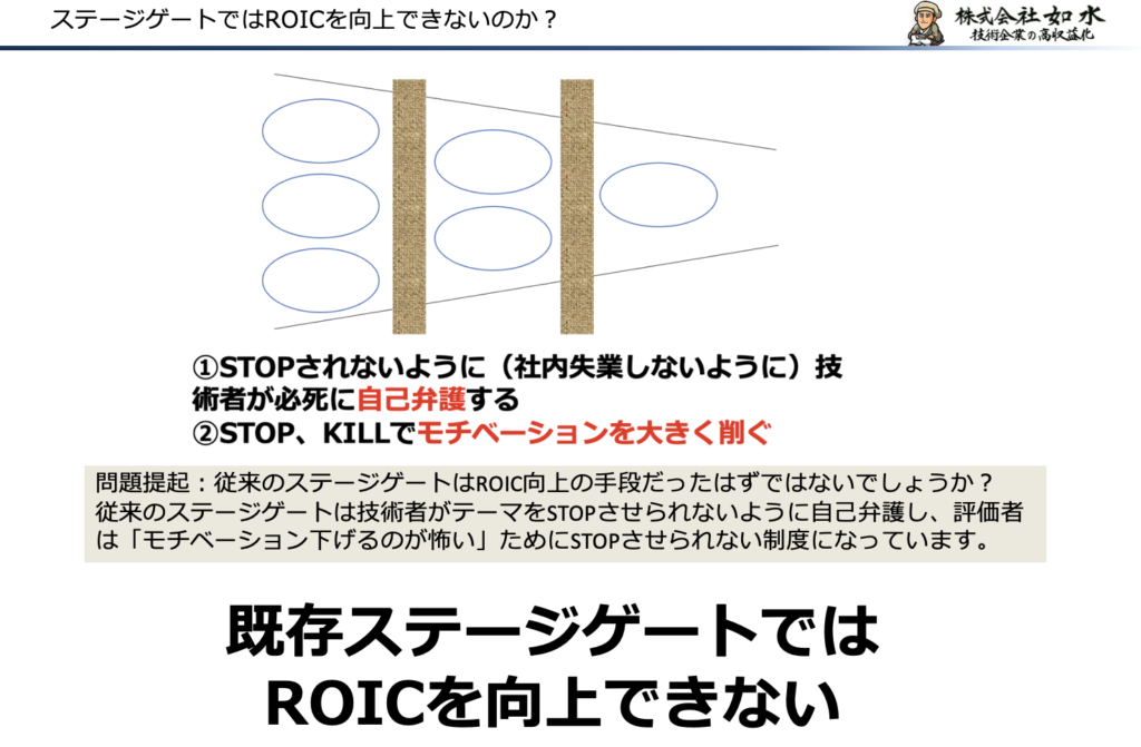 多くの企業では、研究開発の管理手法としてステージゲート制度が導入されています。本来、これはテーマの新陳代謝を促し、資源配分を最適化するための仕組みでした。しかし現実には、テーマを止められない制度になっているケースが少なくありません。技術者はテーマを継続するために自己弁護を行い、評価者はモチベーション低下を恐れて厳しい判断を避ける。その結果、ROIC向上に寄与しないテーマが温存されてしまいます。