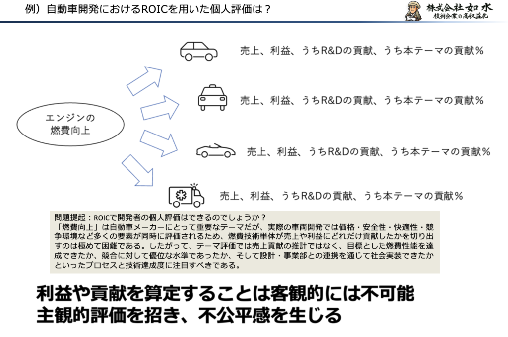 研究開発の成果は、単一のテーマや個人の努力だけで完結するものではありません。複数の技術が組み合わさり、設計、生産、品質保証、営業など、さまざまな部門の連携を経て、初めて事業価値として結実します。このような特性を持つ活動に対して、最終的な利益やROICを直接ひも付けて評価しようとすること自体に、構造的な無理があります。