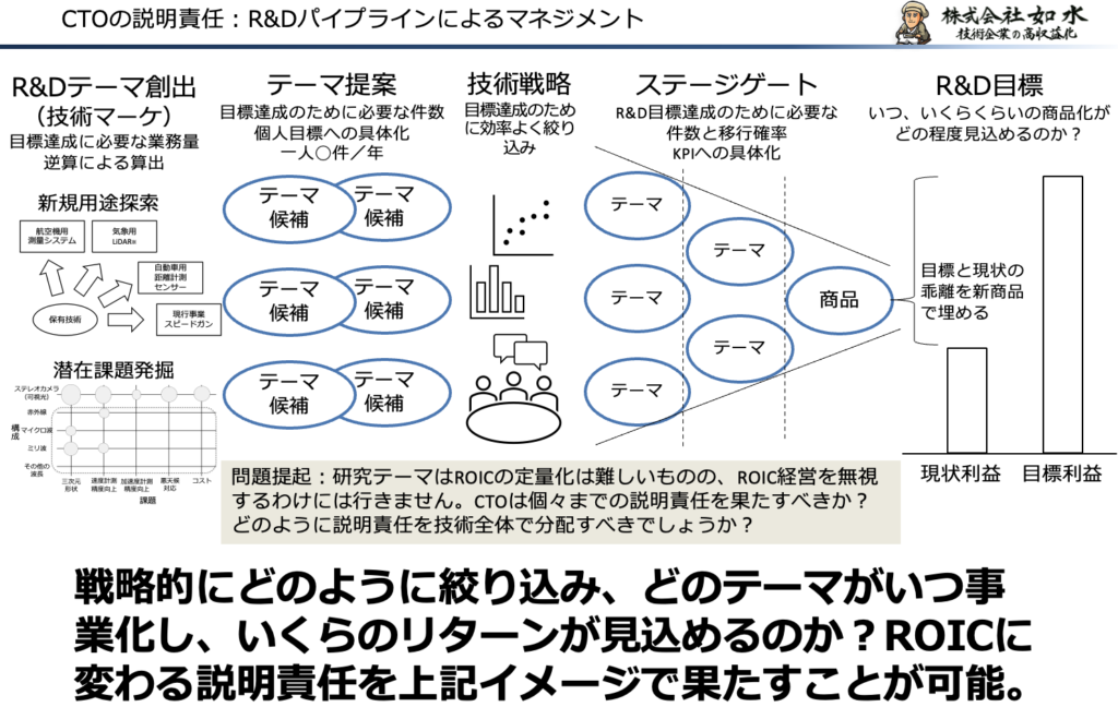そして、この説明責任を個々の研究者に過度に負わせるのではなく、R&Dパイプライン全体としてどのように価値創出を目指しているのかを示すことが、CTOやR&Dマネージャーの重要な役割になります。ROICを直接評価指標として使えないからこそ、R&D全体の構造と意図を言語化し、経営に説明する力が問われているのです。