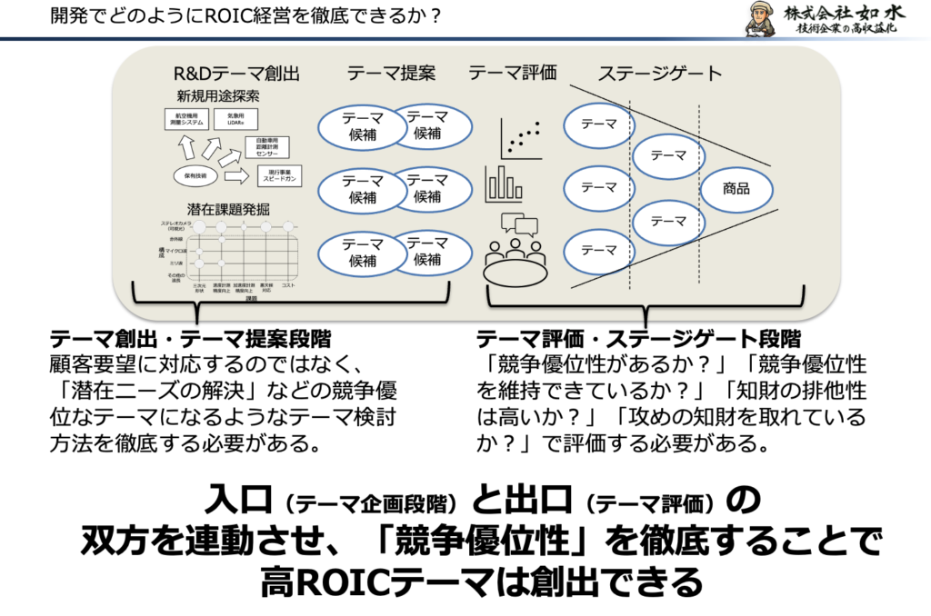 ROIC経営下における開発マネジメントでは、評価軸を競争優位性に置くことが重要です。顧客価値の独自性、技術の独自性、コスト構造や供給体制の優位性など、どこで勝つのかを明確にする必要があります。この視点を持つことで、ROICの数字は結果として説明できるようになります。