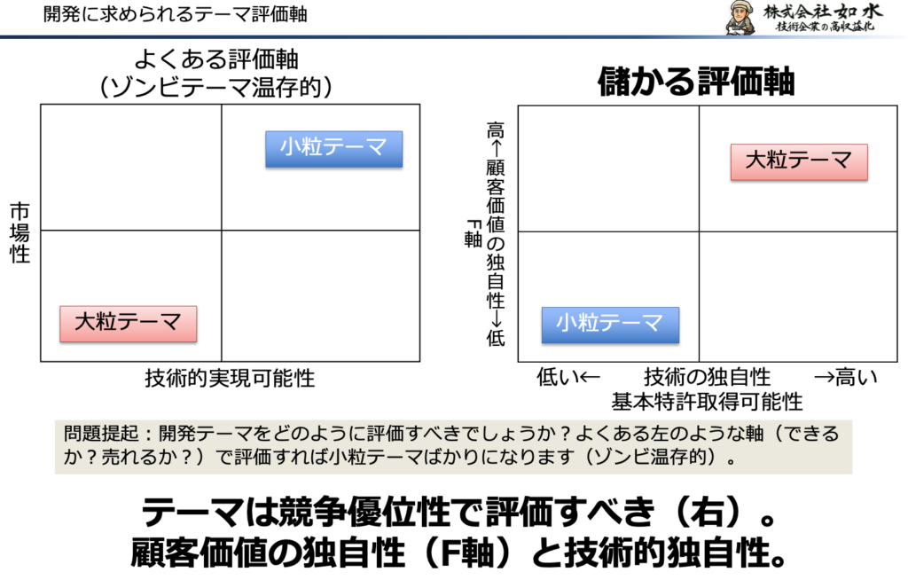 「顧客の潜在ニーズの解決」と言うテーマ性のあるマネージメントをすれば、競争優位性だけでなく、技術の独自性が伴ったテーマが立案されます。そうすることで「儲かるか」の指標において、高い評価を得るテーマを立案することができるのです。