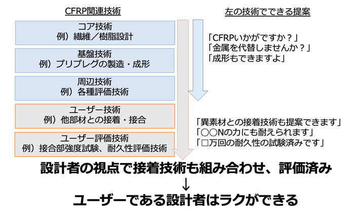 最初に、CFRPの技術者はCFRPを作るのが仕事だから、上のような技術を持っておけば一通りの開発ができる。どんな営業活動をするかといえば、図の右に示す通り、「CFRPはいかがですか?」などというセールストークで材料としてのCFRPを販売することになる。いわゆる、「材料売り」、「部品売り」などと呼ばれる商売だ。