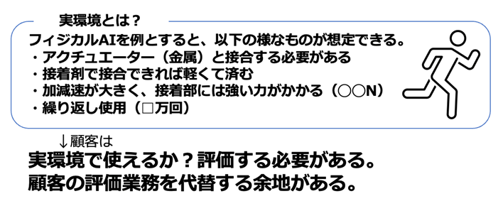 ユーザの実環境には様々な検討事項がある。フィジカルAI、例えばヒューマノイドはジャンプしたり、走ったり止まったりするわけだから、材料には大きな力がかかり、常に振動したり、また繰り返しにも耐えなければならない。そのような実環境において実際に使えるようなものでなければ、どんなに優れた材料でも採用されないのは言うまでもないだろう。