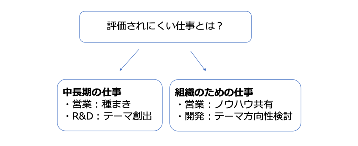 もう一つは「中長期の仕事(来期以降の成果のための仕事)」である。考えてみてほしい。会社は今期の数字を達成するために動いている。中長期計画で3年先の目標が掲げられていることがほとんどなのは認める。しかし、3年先のための種まきが今期の評価になることはほとんどない。営業は今期のノルマを達成しなければならず、その受注活動を技術部門が支援するのが通例だ。そのような組織行動の中では、中長期のための仕事はどうしても後回しにされ、評価対象から外れやすい。