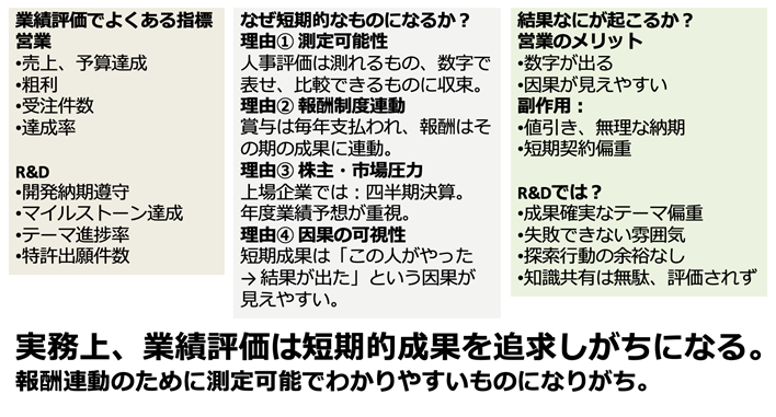 しかし、多くの企業の評価制度見直しに関わってきた立場から言えば、営業や技術開発の現場で中長期の仕事のための評価制度が本当に機能している例は、残念ながらほとんどない。どの会社でも結局は短期テーマで評価され、中長期のテーマを創出するための行動や、組織のための行動は形式的にしか扱われていないことがほとんどである。
