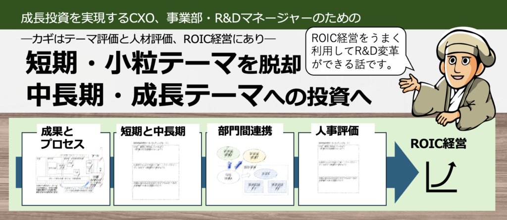 お話頂いた通り、ROIC向上を突き詰めて行くと、営業は短期収益に拘るようになり、RDには風当たりが強くなりRD費を減らせと言われがちで、まさに当社がそのような状況でした。ROIC向上に向けての施策に関し、RD内への説明の際も、経費削減/業務効率upといったありきたりな施策の説明が多くなりがちで、新規ビジネス創出に取り組むメンバーにモーチベーションを上げられるような施策やうまい説明の言葉が見つからず苦労しておりました。
